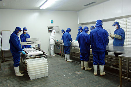 本公司是一家以水產(chǎn)品加工為主的出口型企業(yè),于2004年9月建成并正式投產(chǎn)。公司廠房完全按照歐洲聯(lián)盟的標準設計施工,目前占地14000平方米,建筑面積8000平方米,其中加工車間1600平方米。公司日速凍能力達100噸,儲藏庫容量為5000噸,主要加工蟹類、貝類、頭足類及魚蝦類水產(chǎn)品,產(chǎn)品銷往日本、東南亞及歐盟地區(qū)。